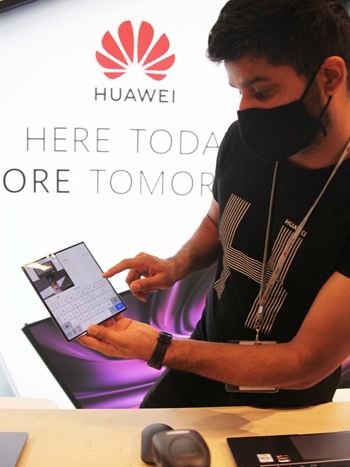 位于英国东伦敦西田购物中心的华为零售旗舰店,一名销售人员在向顾客展示华为折叠屏手机。(图片来源:中新社)
