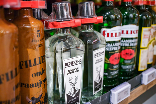 这是3月2日在比利时布鲁塞尔的商店内拍摄的不同品牌的仁内华酒。比利时、德国、法国、荷兰地区生产的任内华酒是中欧地理标志协定中首批受保护的欧盟地理标志产品。