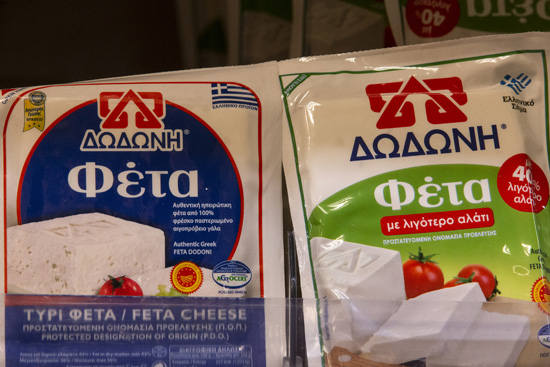 这是3月2日在希腊首都雅典商店内拍摄的不同品牌的菲达奶酪。希腊的菲达奶酪是中欧地理标志协定中首批受保护的欧盟地理标志产品。