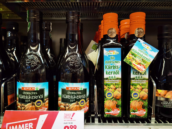 这是3月2日在奥地利维也纳商店内拍摄的施泰尔南瓜籽油。奥地利的施泰尔南瓜籽油是中欧地理标志协定中首批受保护的欧盟地理标志产品。