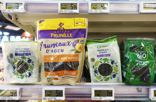这是3月2日在法国巴黎商店内拍摄的不同种类的阿让李子干。法国的阿让李子干是中欧地理标志协定中首批受保护的欧盟地理标志产品。