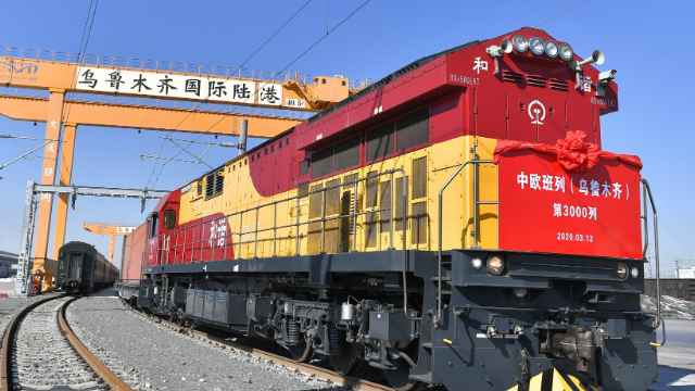 一辆中欧班列由新疆霍尔果斯口岸站出境,前往乌兹别克斯坦塔什干。(图片来源:中新社)
