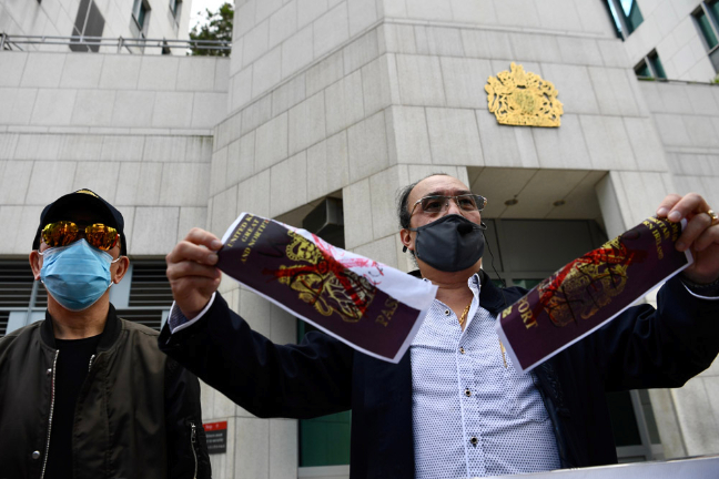 香港同心护港团体到英国驻香港总领事馆抗议英国操弄BNO干预中国内政。(图片来源:中新社)