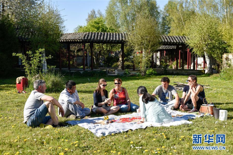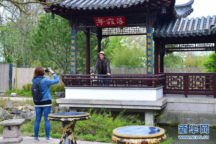 2019年4月13日,在德国曼海姆,游客在“多景园”内的“落霞亭”拍照。(图片来源:新华网)
