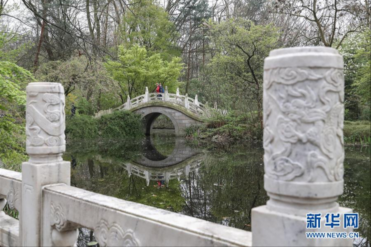 2017年4月7日,两名游客站在德国杜伊斯堡郢趣园内的石桥上。(图片来源:新华网)