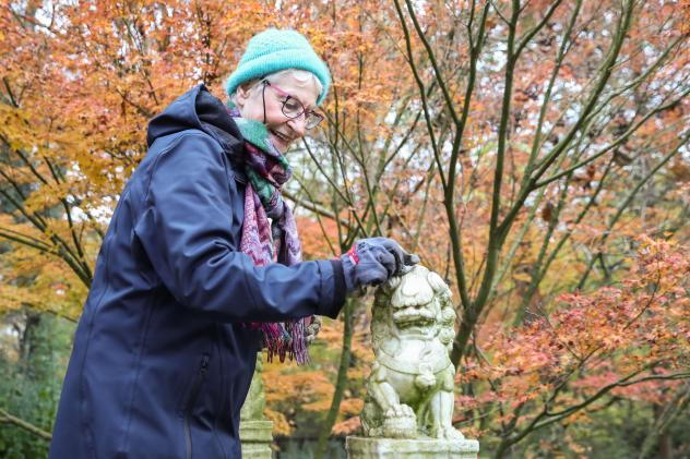 2019年11月16日,在德国杜伊斯堡动物园,一名志愿者擦拭郢趣园内拱桥上的石狮。(图片来源:新华社)