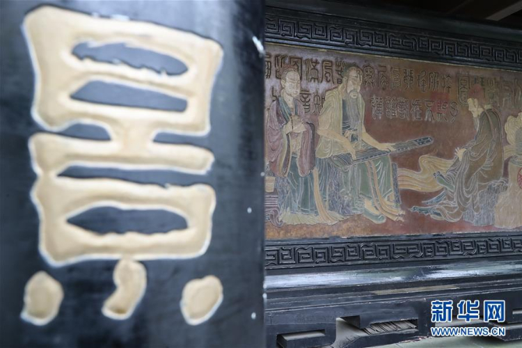 2017年4月7日,在郢趣园内拍摄的一幅雕刻画。(图片来源:新华网)