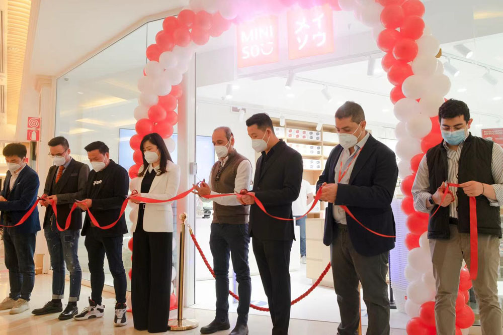 名创优品意大利负责人徐旭伟(右三)与嘉宾共同为新店开张剪彩。(图片来源:名创优品意大利提供)