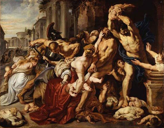 面对战争与欺凌,手无寸铁的母亲很难保护自己的孩子。鲁本斯所画的《对无辜者的屠杀》就表现了这样令人震惊和惋惜的画面。他完成这幅作品时,尼德兰正处于为争取独立而起的“八十年战争”中,此画因而被当作对尼德兰政治和社会形势的一份评述。而在今天,这幅画依然可视为反战的忧心之诉。