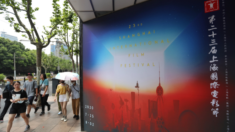 2020年第23届上海国际电影节首张主题海报在上海大光明电影院张贴。(图片来源:中新社)
