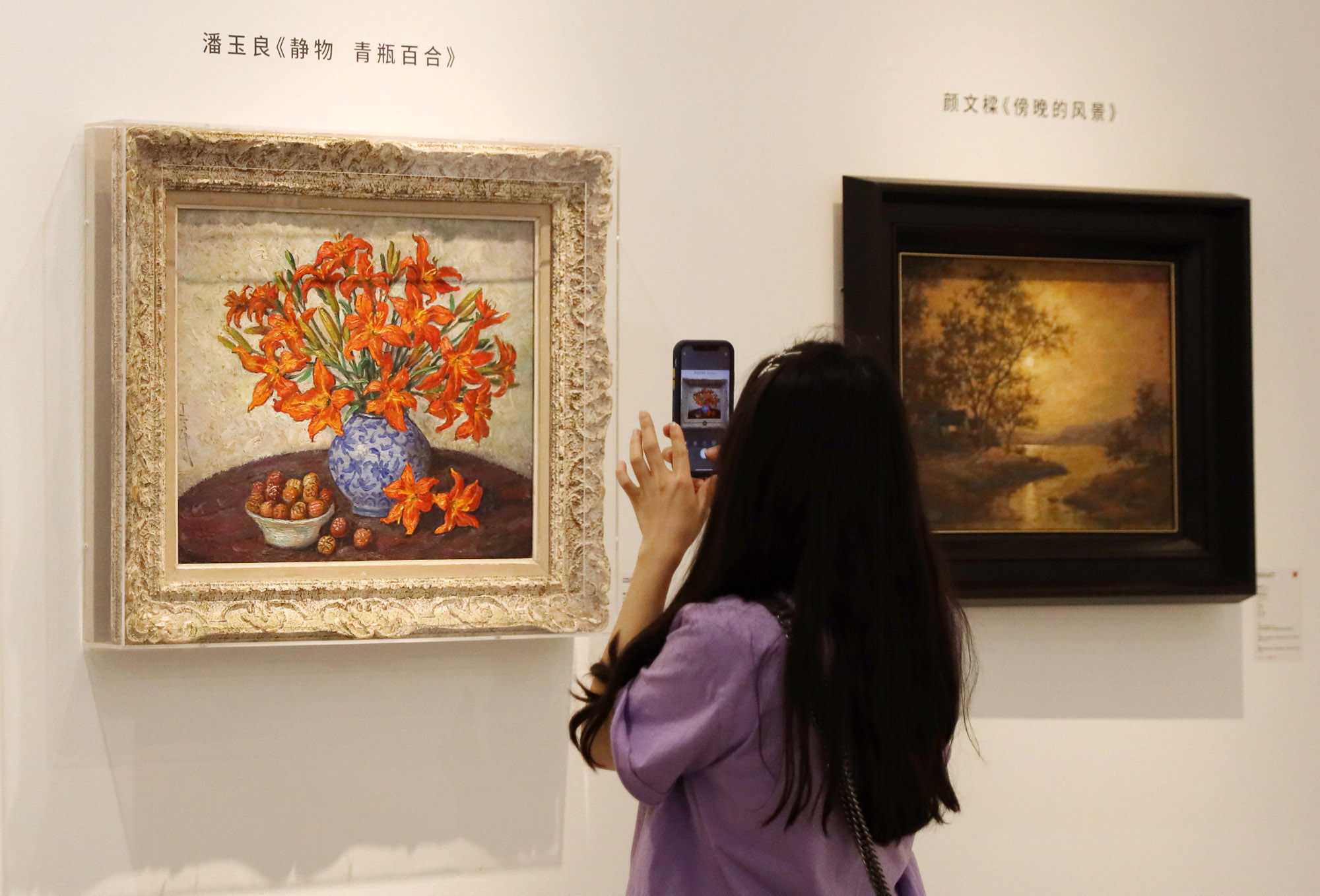 2021年5月17日,观众拿手机拍摄旅法艺术家潘玉良的油画作品《静物青瓶百合》。