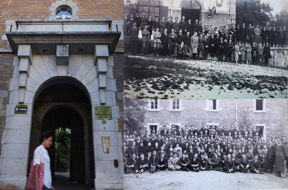 图为法国里昂中法大学旧址(左图)和旅法中国学生在里昂中法大学内合影(右图) 的资料照片。(图片来源:新华社)