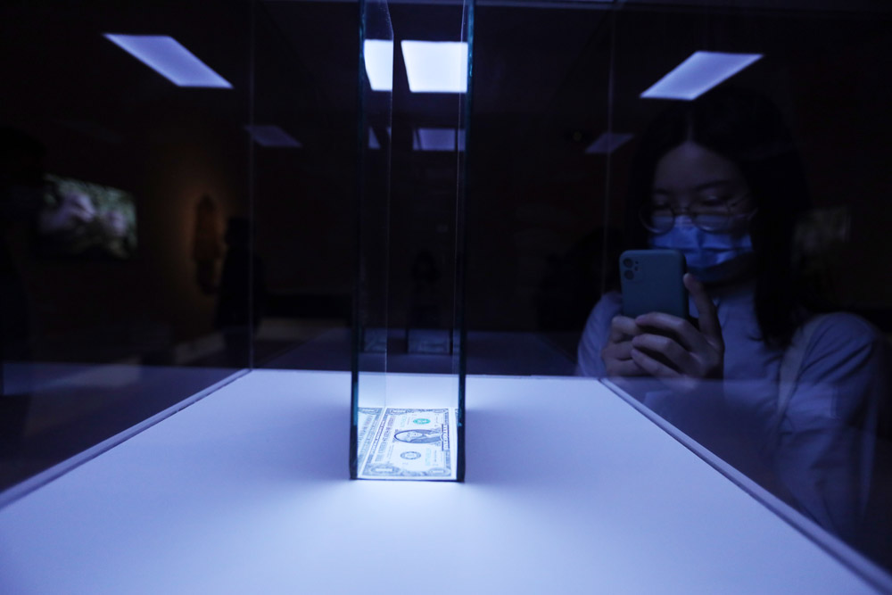 5月28日,观众在红砖美术馆“图像超市”参观装置作品《百万美元》。 (图片来源:本版图片均由欧洲时报特约记者卞戈 摄)