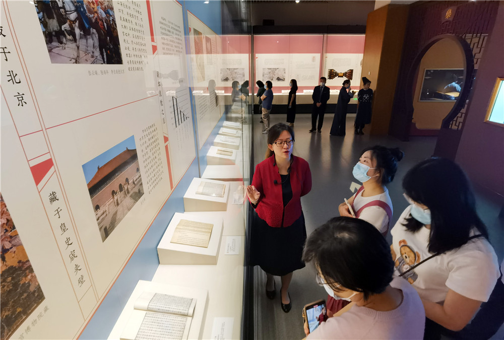 2021年6月1日,讲解员(左一)向参观者介绍《永乐大典》背后的故事。