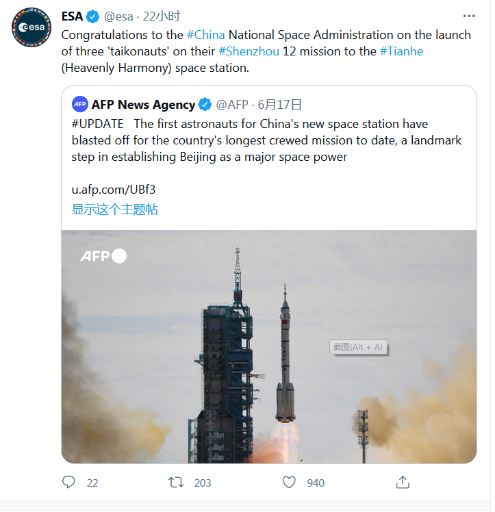 北京时间6月17日,中国成功发射神舟十二号载人飞船后,欧洲航天局(ESA)和俄罗斯联邦航天局(Roscosmos)接连在推特(Twitter)上发来祝贺。