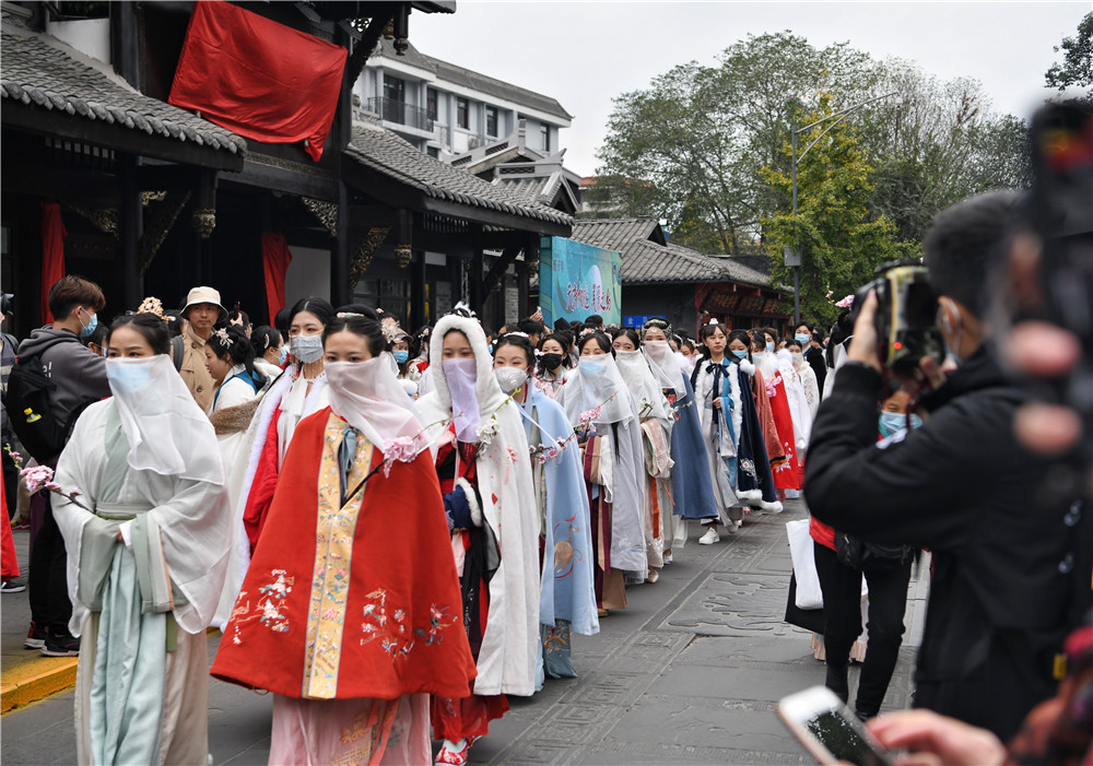 2020年11月22日,在成都市文殊坊,汉服爱好者们参加汉服巡游活动。(图片来源:新华社)