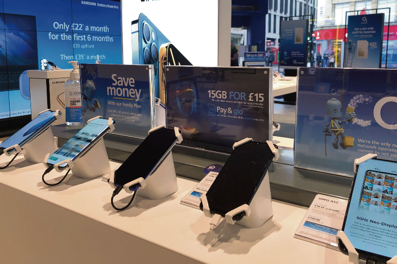 位于伦敦新邦德街的英国通讯运营商O2店内的中国产手机。(图片来源:欧洲时报记者田皓雪子摄)