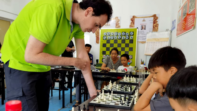 帕斯卡与棋院的中国青少年们切磋交流国际象棋。