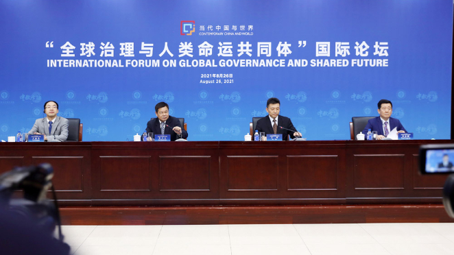 2021年8月26日,由中国外文局当代中国与世界研究院与中欧论坛共同发起的“全球治理与人类命运共同体”国际论坛召开,来自中、法、欧、意等中外学者专家通过线上参与圆桌讨论,共同探讨后疫情时代的全球治理和全球可持续发展。图为论坛北京主会场。(图片来源:欧洲时报特约记者卞戈 摄)