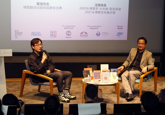 2021年9月24日,傅雷翻译出版奖组委会主席董强(右)与2021年傅雷翻译出版奖特邀评委、2020年傅雷翻译出版奖获奖译者汪炜在发布会现场展开对话。