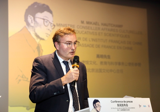 2021年9月24日,法国驻华大使馆文化、教育与科学事务公使衔参赞高明(Mikaël Hauchamp)在发布会上致辞。