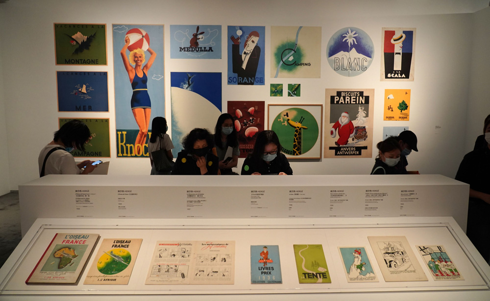 8月5日,上海当代艺术博物馆与比利时埃尔热博物馆联合举办的丁丁主题展“丁丁与埃尔热”在上海开幕。图为观众在观看展出的埃尔热设计的广告海报等作品。(图片来源:新华社)
