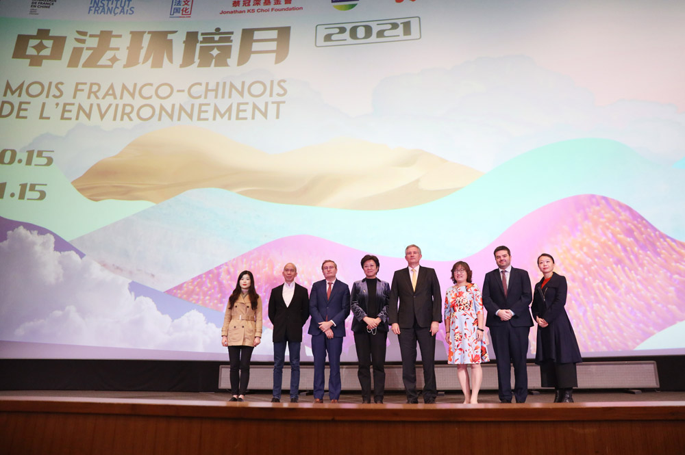出席2021年中法环境月开幕式的法中两国嘉宾一同合影。当日,以“地球的资源”为主题的2021年中法环境月开幕式在北京举行,法语短片小说创作大赛及2021年“中法环境月”青少绘画大赛颁奖典礼同期举行。(图片来源:本文图片均为欧洲时报特约记者卞戈 摄)