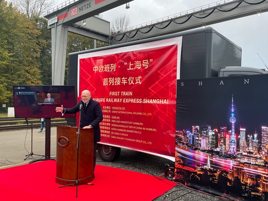 10月26日,首班“中欧班列-上海号”顺利抵达德国汉堡。图为汉堡市经济部长韦斯特哈格曼在接车仪式上致辞。(图片来源:中新社)