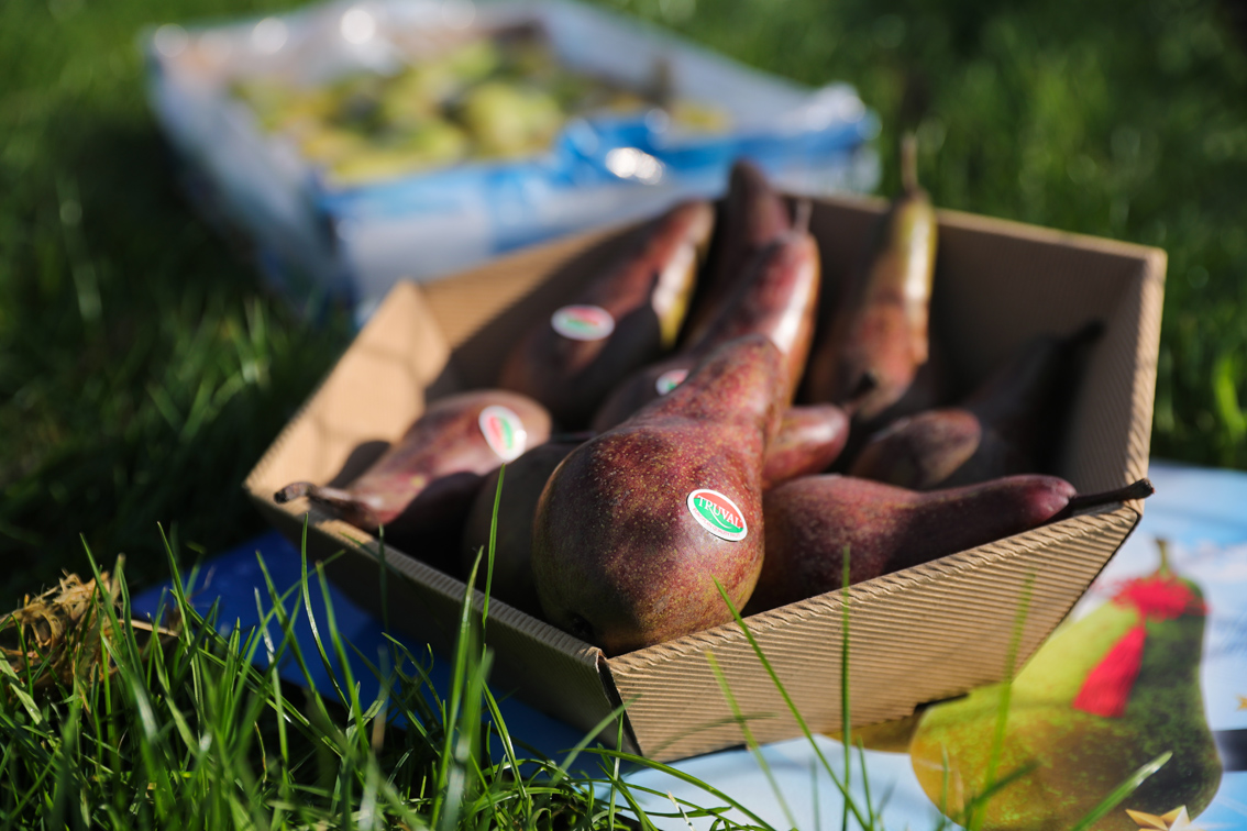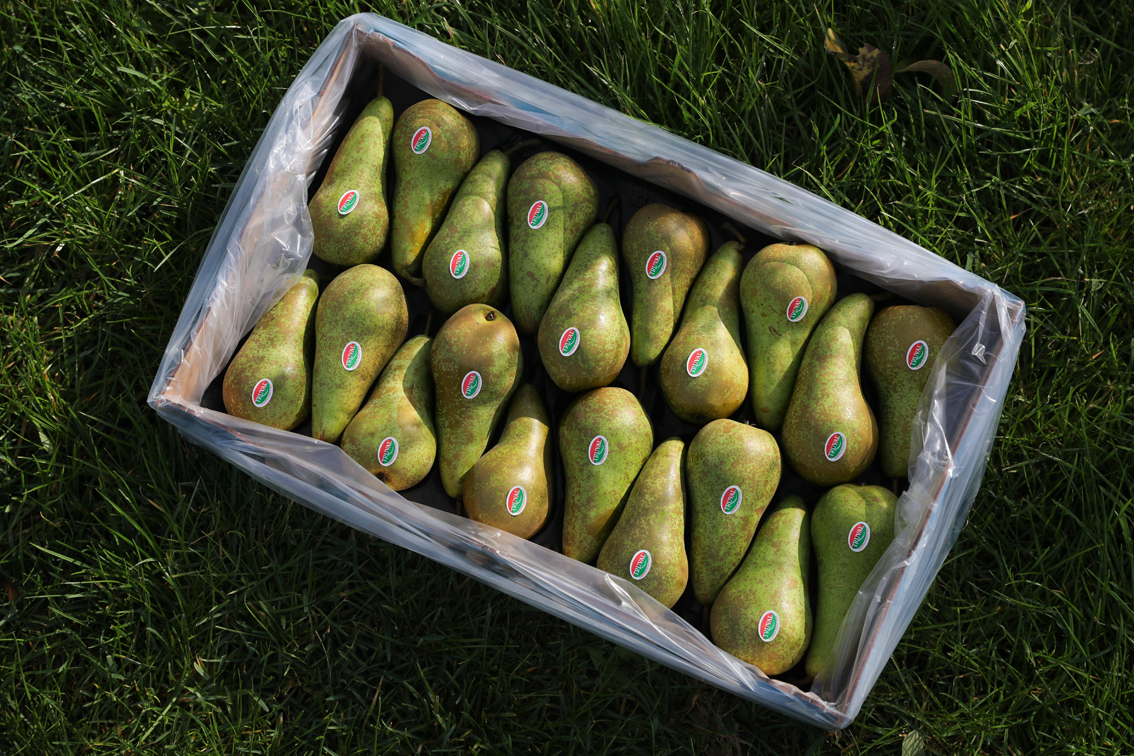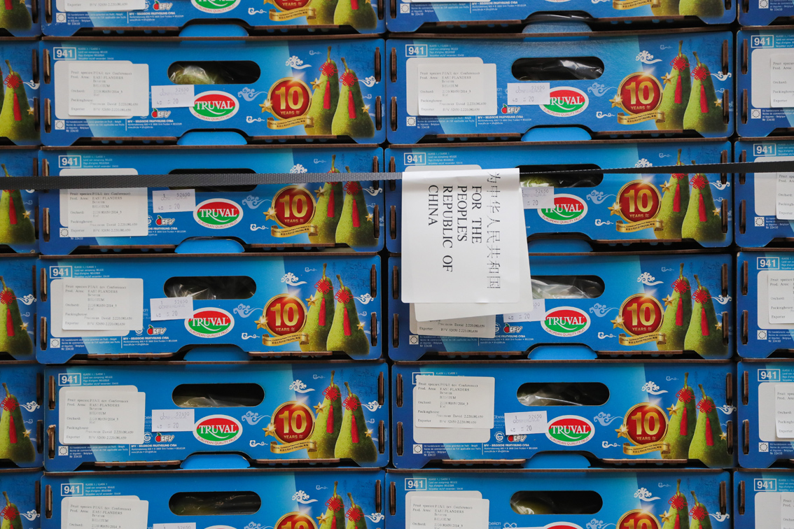 这是10月22日在比利时弗拉瑟讷的比利时水果山谷协会拍摄的即将出口至中国的啤梨。