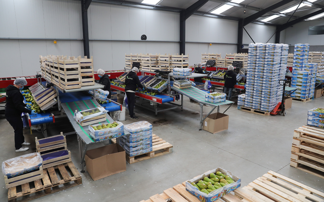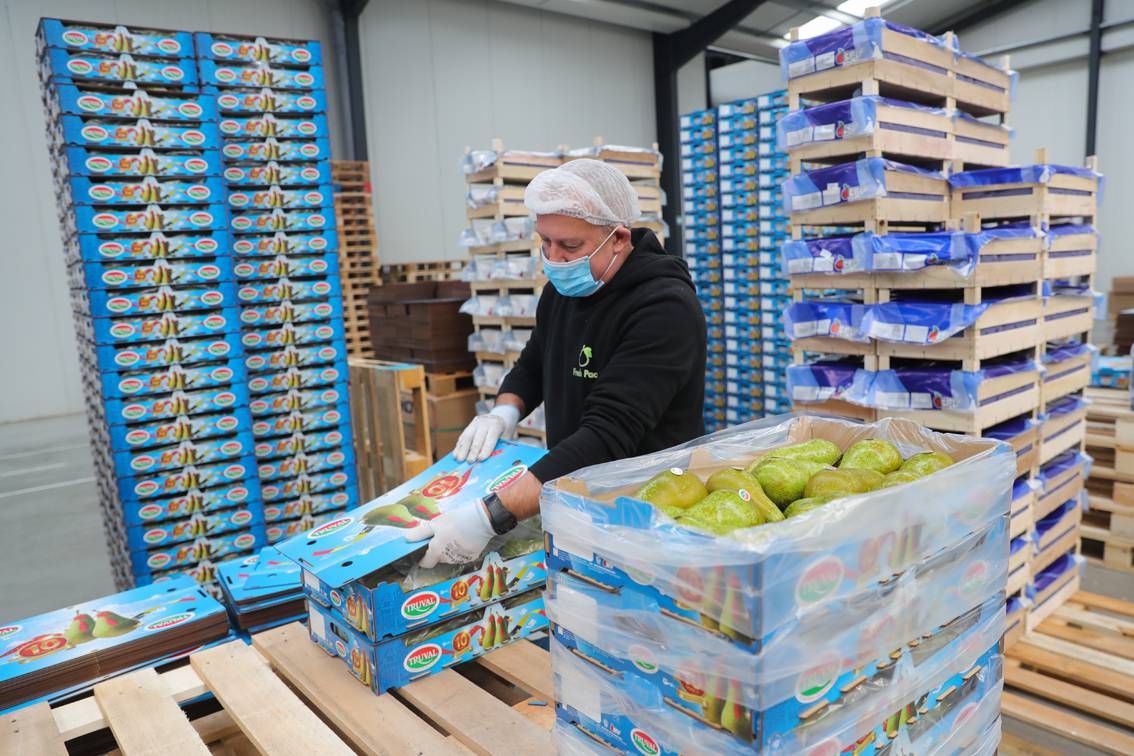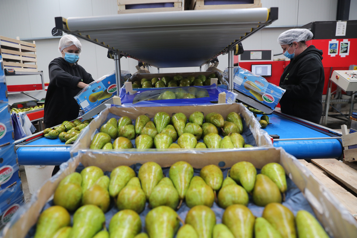 10月22日,工作人员在比利时圣希利斯-瓦斯市的一个水果分拣包装车间将即将出口的比利时啤梨装箱。