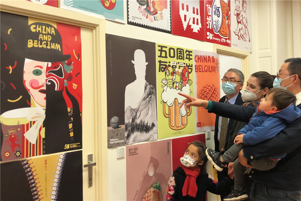 10月30日,观众在比利时布鲁塞尔参观中比建交50周年国际文化海报设计展。(图片来源:新华社)