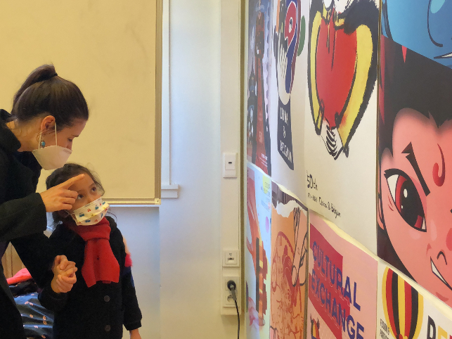 图为当天,观众在比利时布鲁塞尔参观中比建交50周年国际文化海报设计展。(图片来源:本文图片均自新华社)