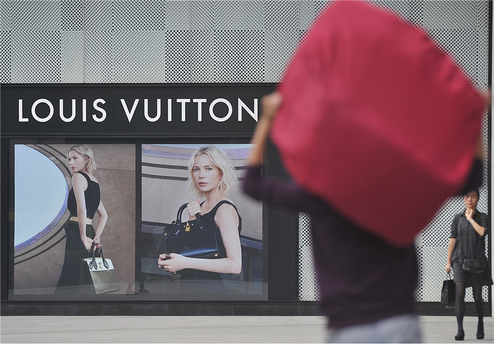 福州市民从路易威登广告牌旁经过。(图片来源:中新社)