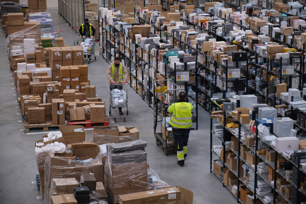 11月11日,工作人员在西班牙瓜达拉哈拉市的菜鸟网络所设立的海外仓中工作。(图片来源:新华社)