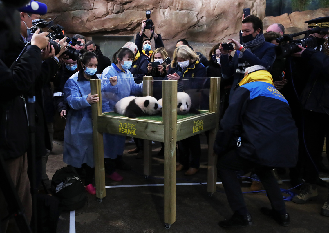 11月18日,在法国中部圣艾尼昂市博瓦勒野生动物园熊猫馆,来自中国四川成都的保育员将大熊猫双胞胎宝宝送到命名仪式现场。