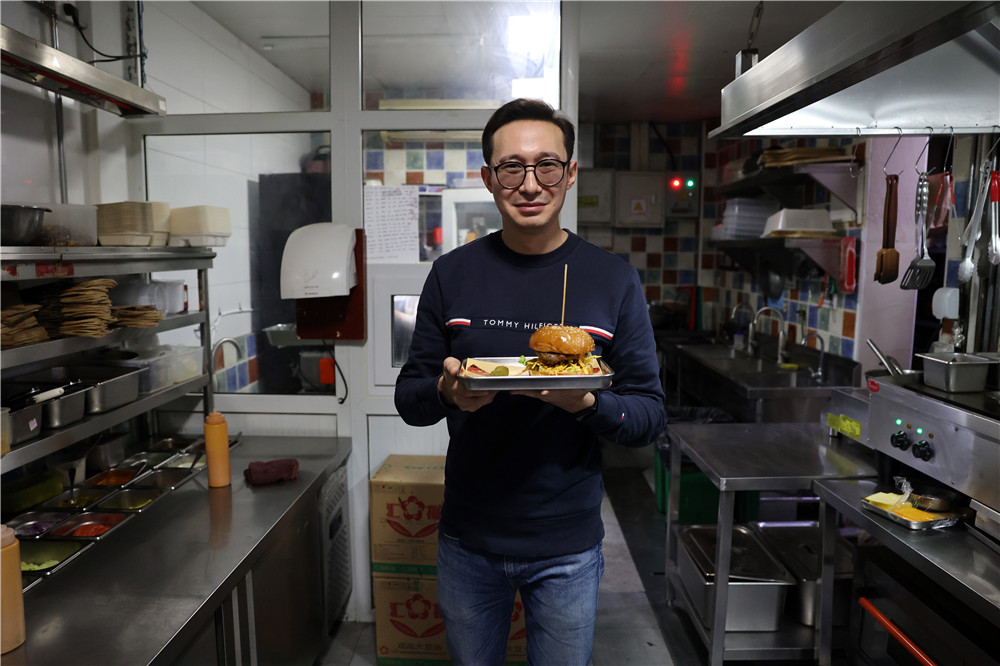2021年11月23日,SIDE STREET店长Daulèt接受本报记者专访。据介绍,SIDE STREET街旁在2020年北京汉堡杯比赛中一路披荆斩棘,拿到了2020北京汉堡杯的冠军。SIDE STREET店长Daulèt在店内接受本报记者专访,讲诉自己与汉堡结缘的故事及店内的汉堡特色文化。(图片来源:本文图片均由本报特约记者李大鹏 摄)