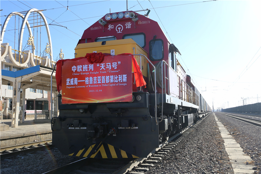 12月4日11时30分,满载着50车40英尺集装箱货物的75097次甘肃武威南至格鲁吉亚首都第比利斯中欧班列在武威南站缓缓驶出。这是甘肃发往格鲁吉亚第比利斯的首趟班列。