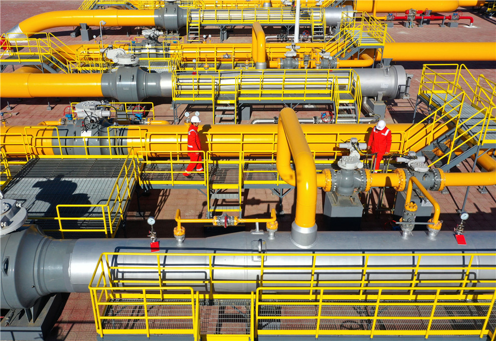 2020年12月3日,在中俄东线中段天然气管道河北廊坊永清联络压气站,技术人员对输气管道进行安全巡检。(图片来源:中新社)