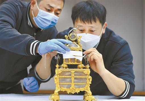 1月13日,工作人员开箱展示文物“嵌宝石琴钟”(英格兰,伦敦,约1770年)。(图片来源:本文图片均自湖南日报)