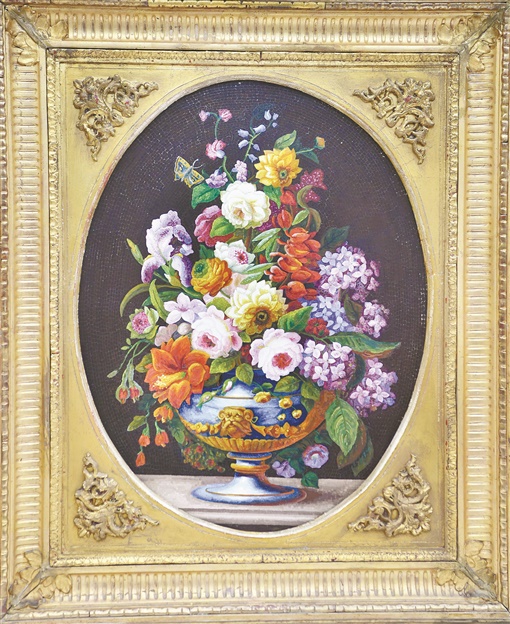 1月13日,即将展出的文物“花卉静物”微型马赛克、鎏金木框(意大利,罗马,约1840-1860年)。