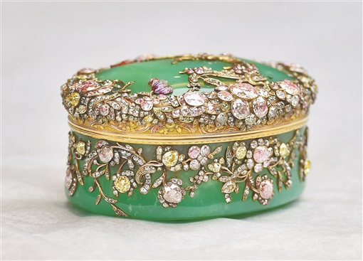 1月13日,即将展出的文物“绿玉髓镶钻鼻烟盒”(德国,柏林,约1765年)。