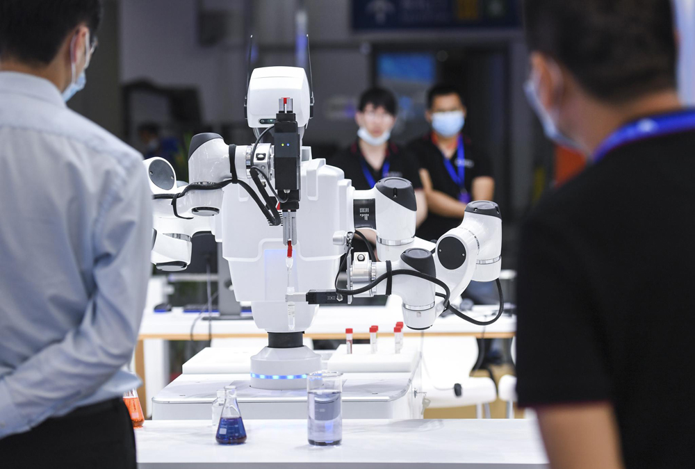 2021年4月24日,在中国国际人才交流大会上,与会者参观可应用于生化医疗领域的机器人。(图片来源:新华社)