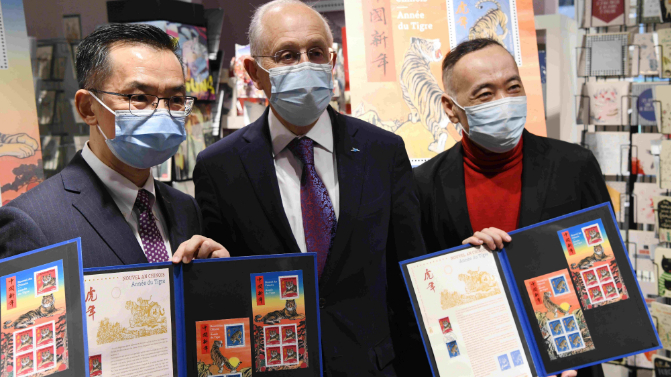 法国邮政1月22日在巴黎举行虎年生肖邮票发行仪式,迎接中国新春佳节。