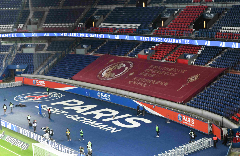 1月23日晚,法国巴黎,在虎年春节即将到来之际,中国驻法大使馆再度与法国职业足球联盟举办“中国日”活动。图为赛场看台上悬挂着“巴黎圣日尔曼祝中国球迷朋友虎年大吉!虎虎生威!”的巨型中文横幅,横幅上印着圆形的老虎图案。(图片来源:中新社)
