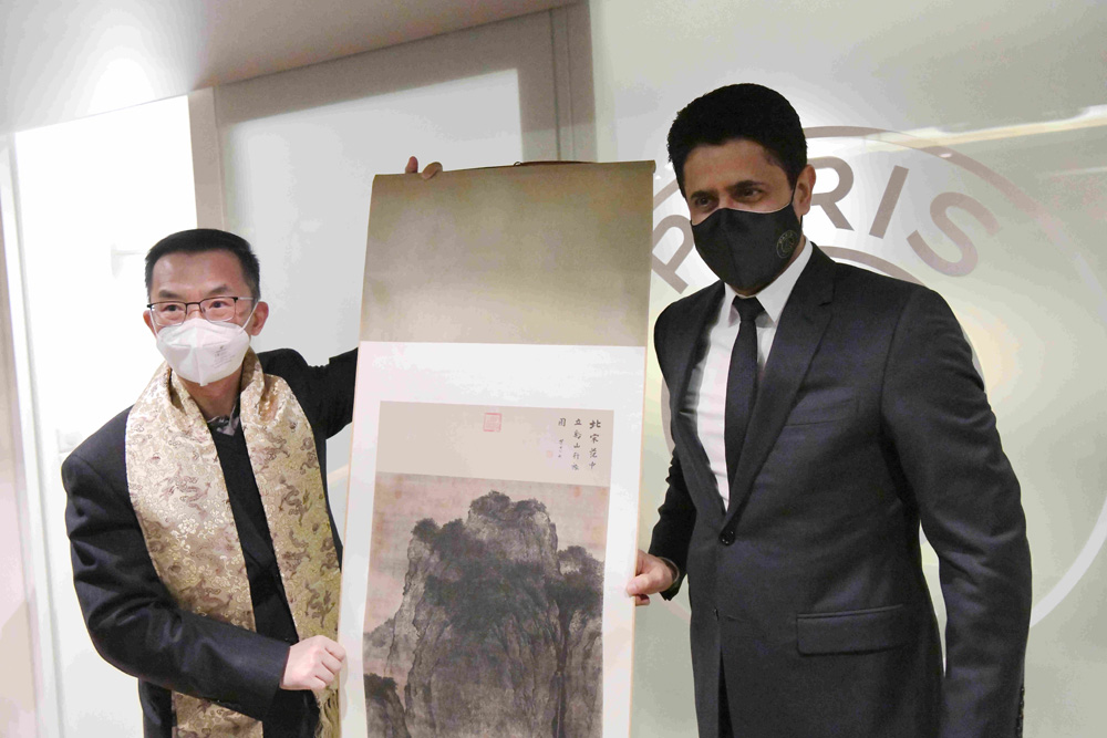 图为中国驻法大使卢沙野向巴黎圣日尔曼足球俱乐部主席纳赛尔赠送中国画。(图片来源:中新社)