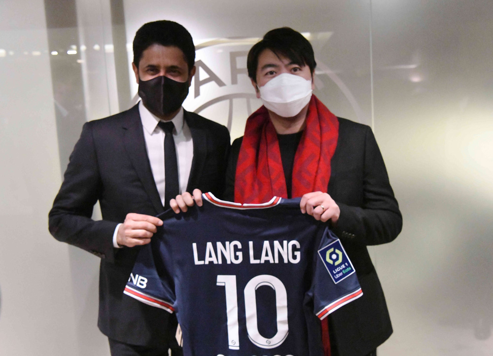图为巴黎圣日尔曼足球俱乐部主席纳赛尔向出席活动的钢琴家郎朗赠送巴黎圣日尔曼10号球衣。(图片来源:中新社)