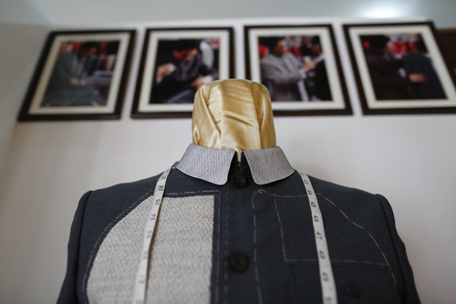 “华人礼服”服装店墙上挂着各国领导人穿中山装的照片。(图片来源:中国侨网)