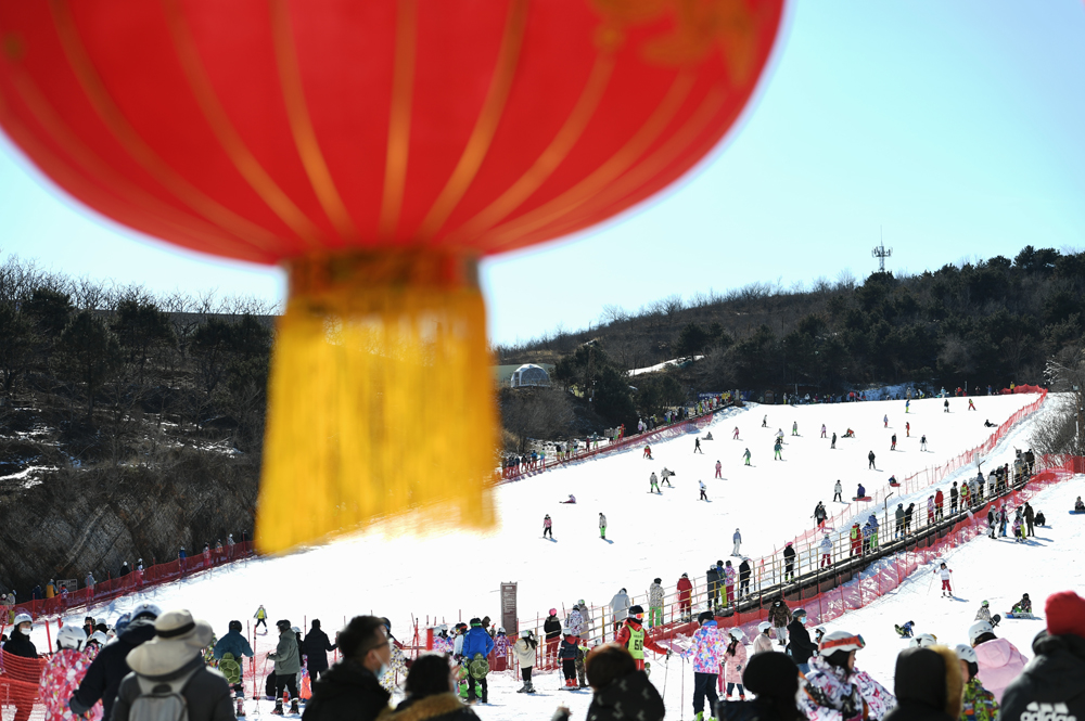 2月3日,农历正月初三,滑雪爱好者在天津蓟州国际滑雪场体验冰雪运动。即将开幕的北京2022年冬奥会带热了冰雪运动。(图片来源:中新社)