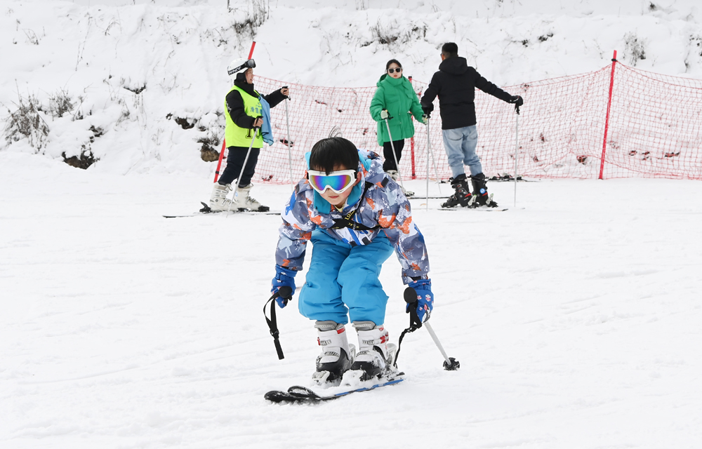 1月4日,四川省茂县九鼎山太子岭滑雪场,民众体验滑雪运动。(图片来源:中新社)
