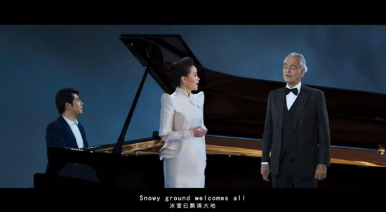 歌曲《永远在一起》雷佳、安德烈·波切利两位中意歌唱家共同演唱,郎朗担任钢琴演奏。(图片来源:视频截图)